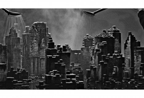 Hans Op de Beeck works with a variety of media, including sculpture, installation, video, photography, painting, and writing. Introducing strange elements to familiar characters and locations, Op de Beeck creates an uncertain sense of time and place. His still lifes, landscapes, and interiors explore how our vision of the world is shaped by a blend of genre, imagination, and memory. This exhibition presents Op de Beeck’s black-and-white video Staging Silence (2) (2013). Expanding on the intricacy of Staging Silence (2009), the work shows a series of miniature dioramas being seamlessly assembled. Only the hands and arms of the off-screen builders are visible, while their actions, and the settings they create, fade in and out of view. A snow-covered forest, modernist apartment, and futuristic cityscape, along with many other scenes, are created using everyday materials, dramatic lighting effects, and tricks of perspective. Watching the illusions take shape, viewers are pushed between material reality and shadowy, dreamlike environments, which call up mysterious stories.